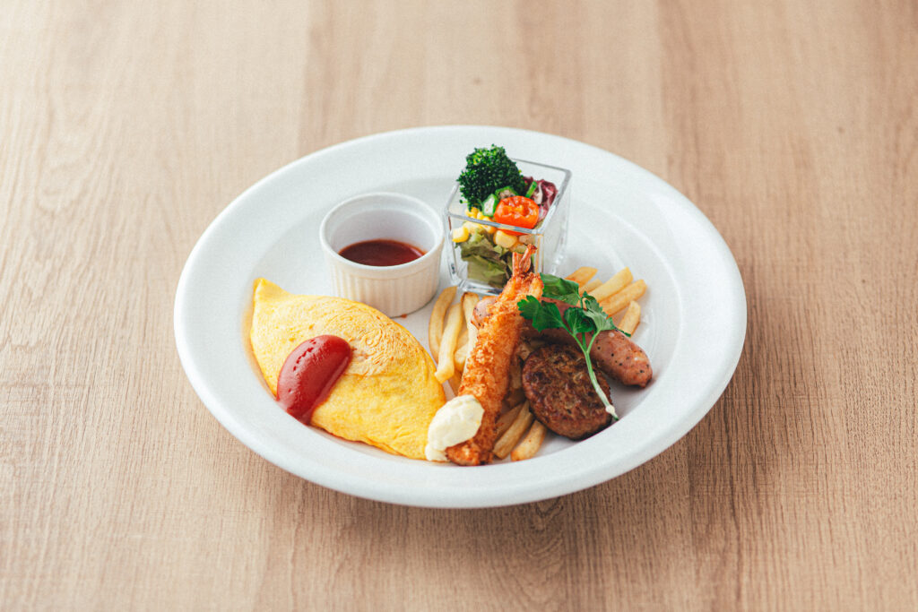オムライス/エビフライ/ソーセージ/ポテトフライ/サラダ/デザート