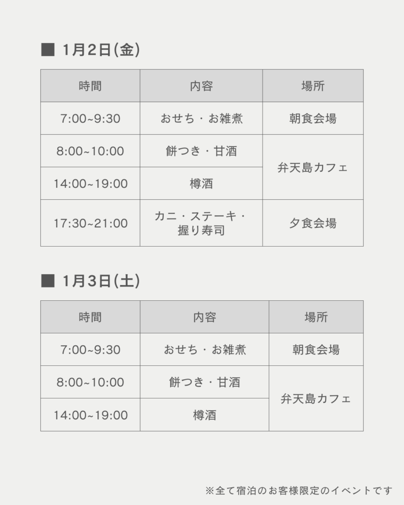 大晦日およびお正月のイベントスケジュールのご案内です。