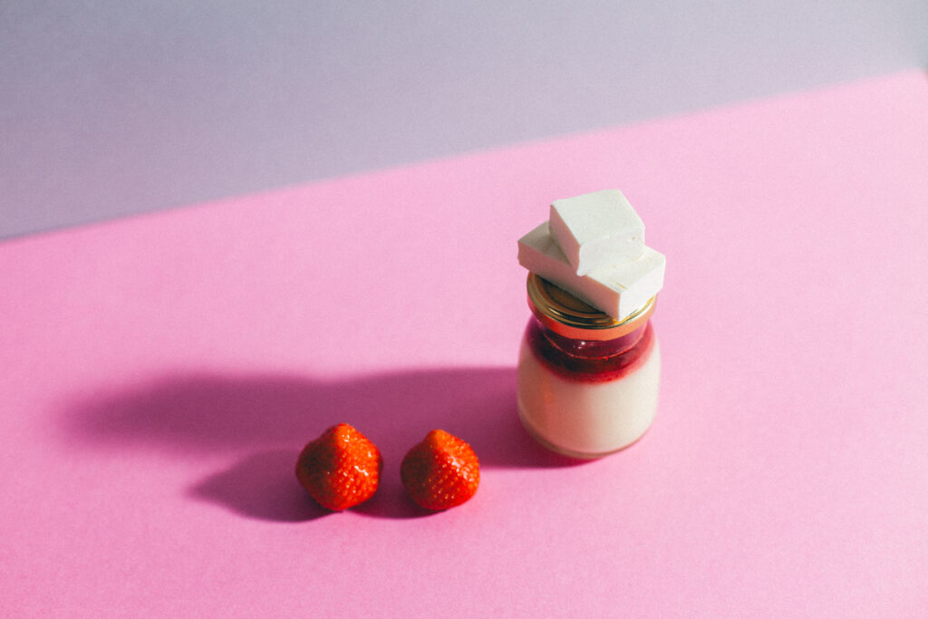 チーズ風味のプリンの上に、いちごの果肉入りジャムをのせました。